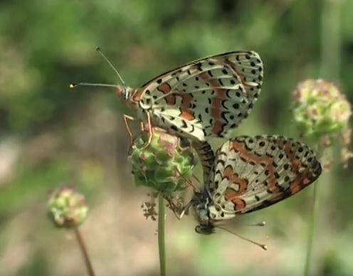 In the South of France the Spotted Fritillary flies in two generations, from April to June and from July to September, and inhabits flowery meadows and sunny grasslands. The female lays eggs under the leaves of differend herbaceous plants from the family Plantaginaceae and Scrophulariaceae. After 15 days, the eggs hatch. When the caterpillars are mature they go in search of a place to pupate. The small caterpillars of the second generation overwinter in dried plant-parts in the vegetation.