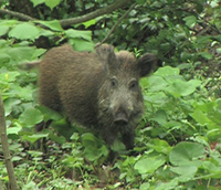 Le sanglier (Sus scrofa) est un mammifère omnivore, forestier, proche du porc. Sa femelle se nomme la « laie », les petits sont des « marcassins », les jeunes sont parfois appelés « bêtes rousses » et les mâles adultes des « solitaires ». Il sélectionne ses habitats selon la saison, l'heure du jour ou de la nuit et ses besoins alimentaires. Les compagnies de sangliers sont constituées d'une ou plusieurs laies suivies de leur progéniture. Les ragots (sangliers de 2 à 4 ans) ferment la marche lors des déplacements, mais sont remplacés par des mâles plus âgés en période de rut. Les cortèges sont souvent bruyants, non seulement par le bruit lourd des pas, mais aussi par les grognements, cris, soufflements et autres reniflements. Cependant, les sangliers savent se montrer discrets et silencieux s'ils se sentent menacés. Cependant, là où il est anormalement abondant, suite de la disparition de ses prédateurs sauvages, il occasionne en outre alors des dégâts dans les champs, prairies et parfois dans les jardins en y mangeant et parfois en retournant profondément les sols (boutis). (Wikipédia).